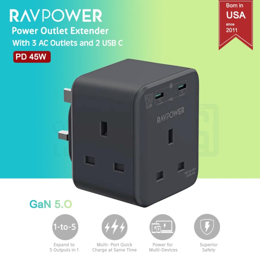 شاحن جداري راف باور بقوة 45 واط بثلاث منافذ طاقة - اسود